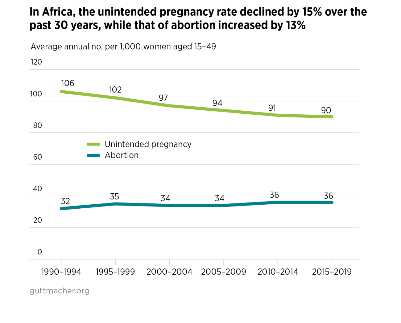 The estimates below provide an overview of the incidence of unintended pregnancy and abortion in Africa from 1990 through 2019; the values are based on average annual estimates for five-year time periods. To view these estimates for countries within this region, find specific country profiles on guttmacher.org.